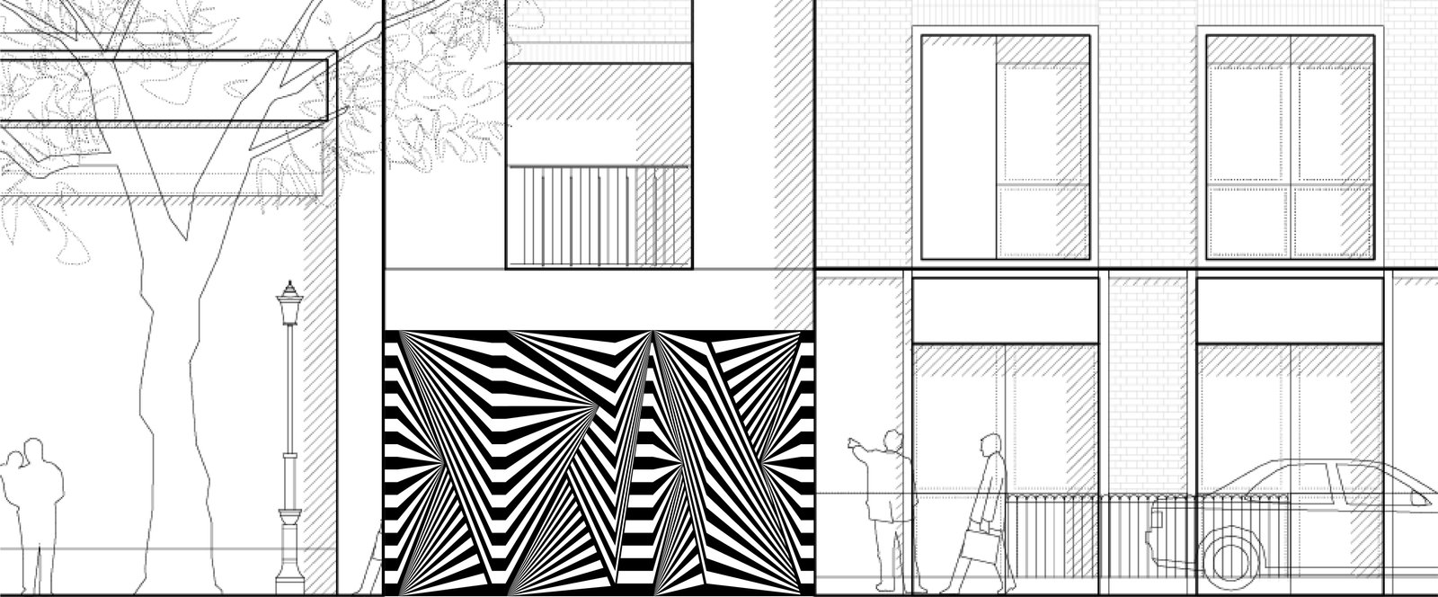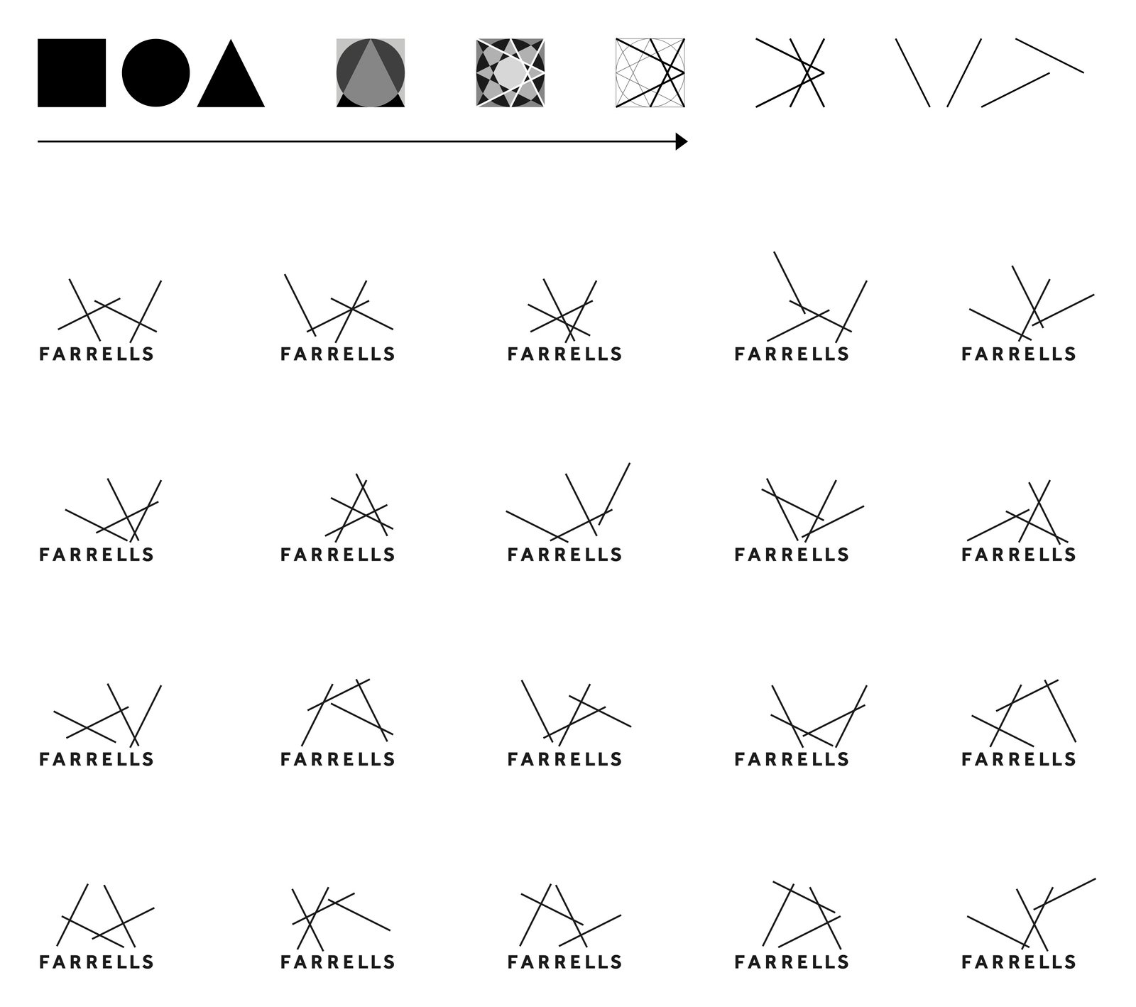 Referencing practice’s association with postmodern thought, I sketched a concept that used as a starting point, basic geometric shapes, that I then overlapped and reduced to the most important architectural element — the line. Resulting lines were then used freely in endless combinations to create a ‘living’ identity unique with every new application.