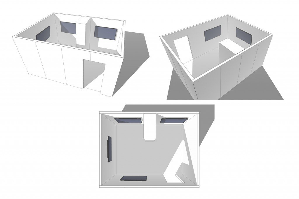 The immersive theatrical installation comprised of four synchronized video displays set in a completely dark ‘glossy black’ painted MDF room. Screens were positioned so that it would be impossible to see all four of them at any given moment, they were completely black during inactive moments, and they were small enough to make the viewer move around and physically interact with the ‘room’ in order to follow the active screens.